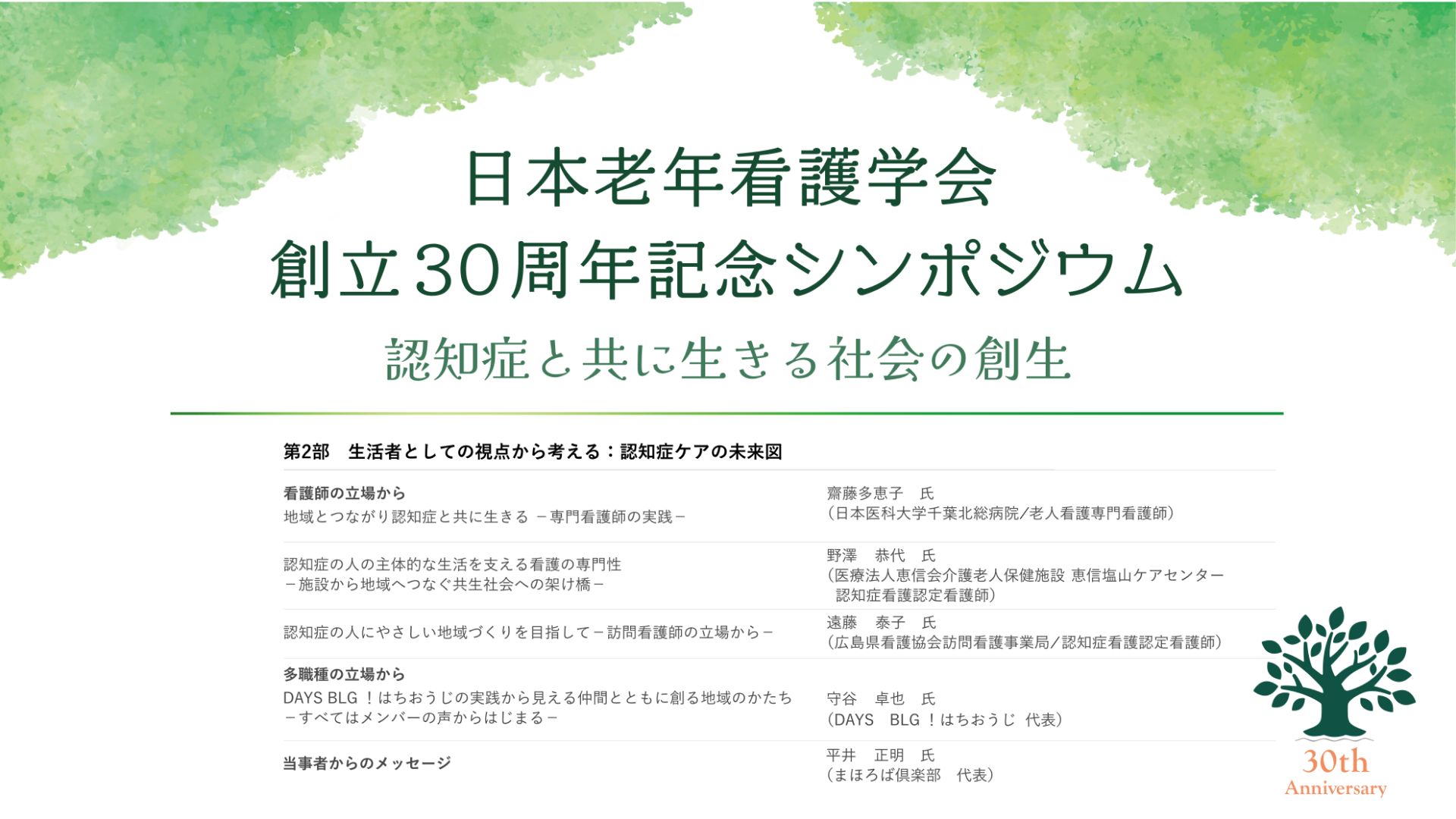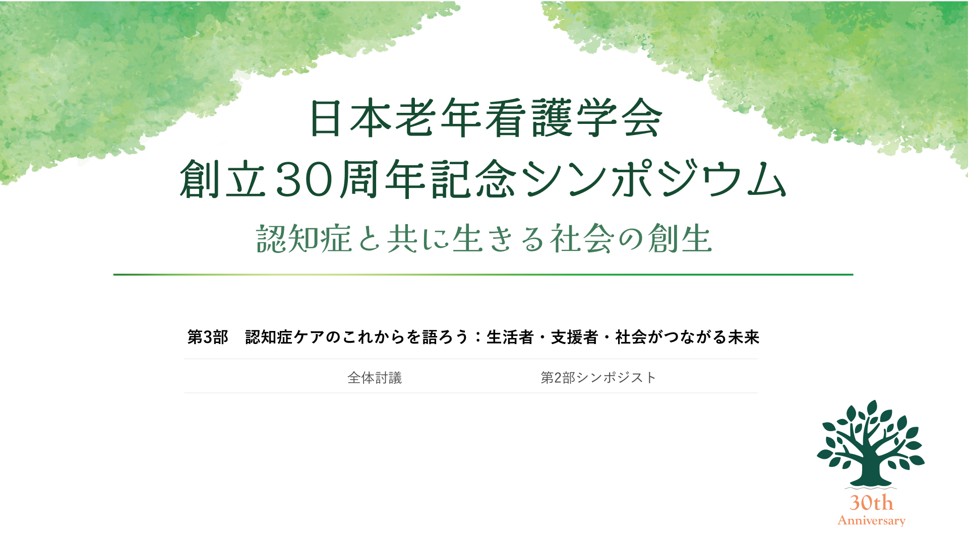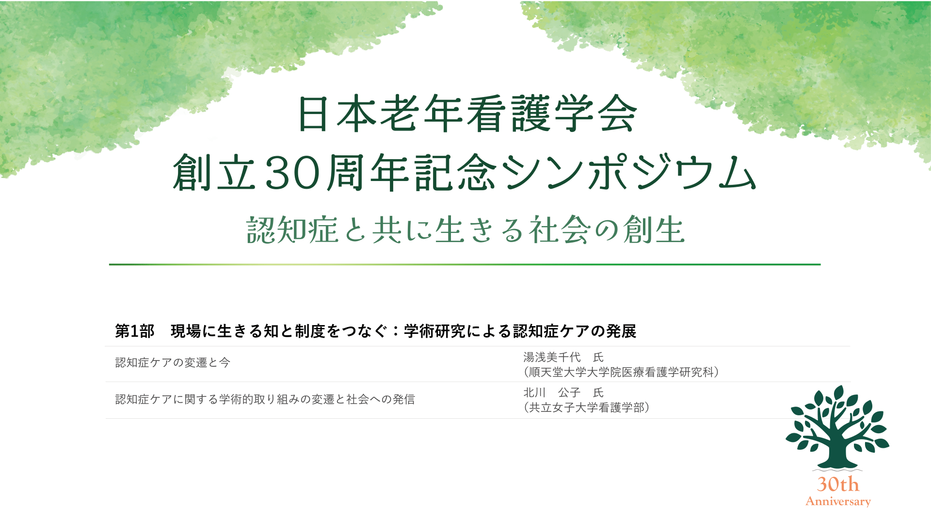 日本老年看護学会が30周年という節目を迎えるにあたり、高齢社会の大きな課題のひとつである「認知症ケア」について、次の10年を見据えながら実践と連携のあり方を改めて見つめ直す目的でシンポジウムを企画しました。